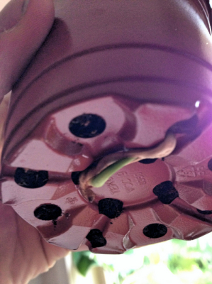Ik heb een halfjaar terug wat zaadjes gekocht tijdens een vakantie in de Canarische eilanden. Ik had toen twee zaadjes van een bottle palm gekocht. Omdat ik het zeer druk had met school en een paar reizen heb gedaan, ben ik dit zaadje uit het oog verloren. Tot ik gisteren eens een checkup ging doen. één zaadje is niets aan het doen en toont kleine witte vlekjes, het andere zaadje (zie foto's) is beginnen kiemen. Bovenaanzicht niets bijzonders, je ziet wat groen dat naar beneden groeit, een wortel? Maar aan de onderkant van het potje, waar de gaatjes zijn, groeit het plantje verder, ik weet niet of het een wortel is of een blad. Want het ziet er mij een wortel uit, maar daarin groeit dan iets groen. Weten jullie wat het is? En hoe ik dit het best verpot zodat het plantje goed kan beginnen groeien? Ik heb gelezen dat deze soort palmen heel erg delicaat en moeilijk te kweken zijn. Daarom ik het goed wil doen.