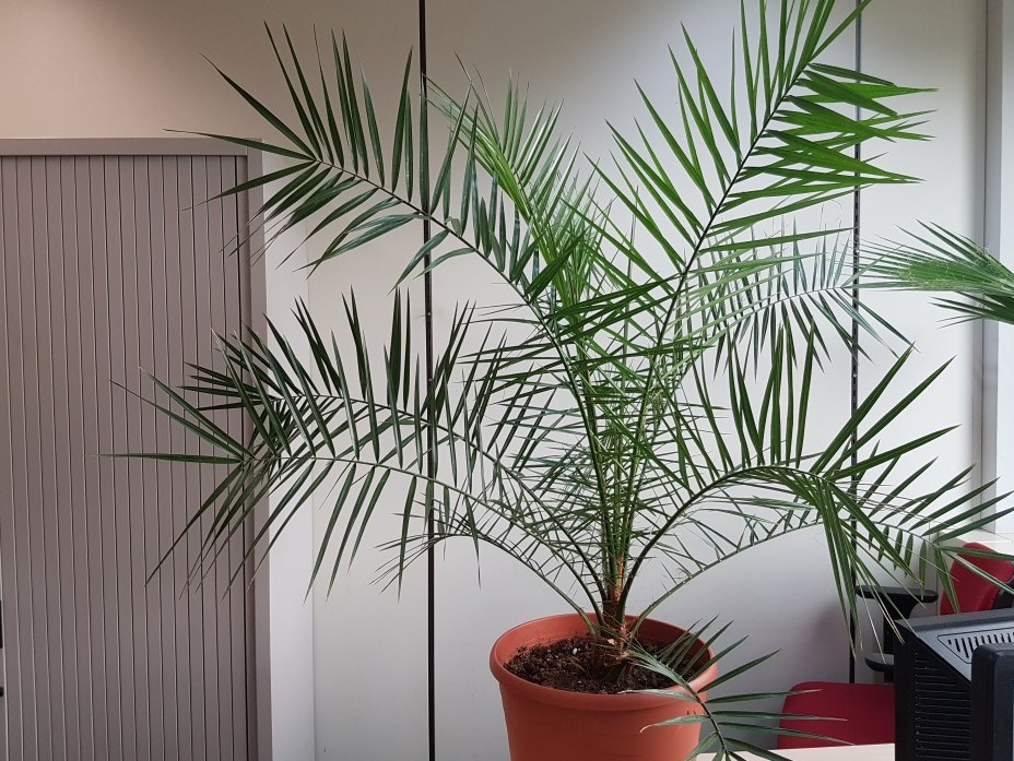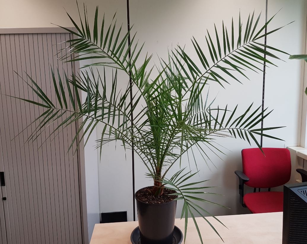 De Phoenix Canariensis is uiteindelijk het kantoor uitgegroeidbij een hoogte incl pot op 190cm, te groot voor de vensterbank.