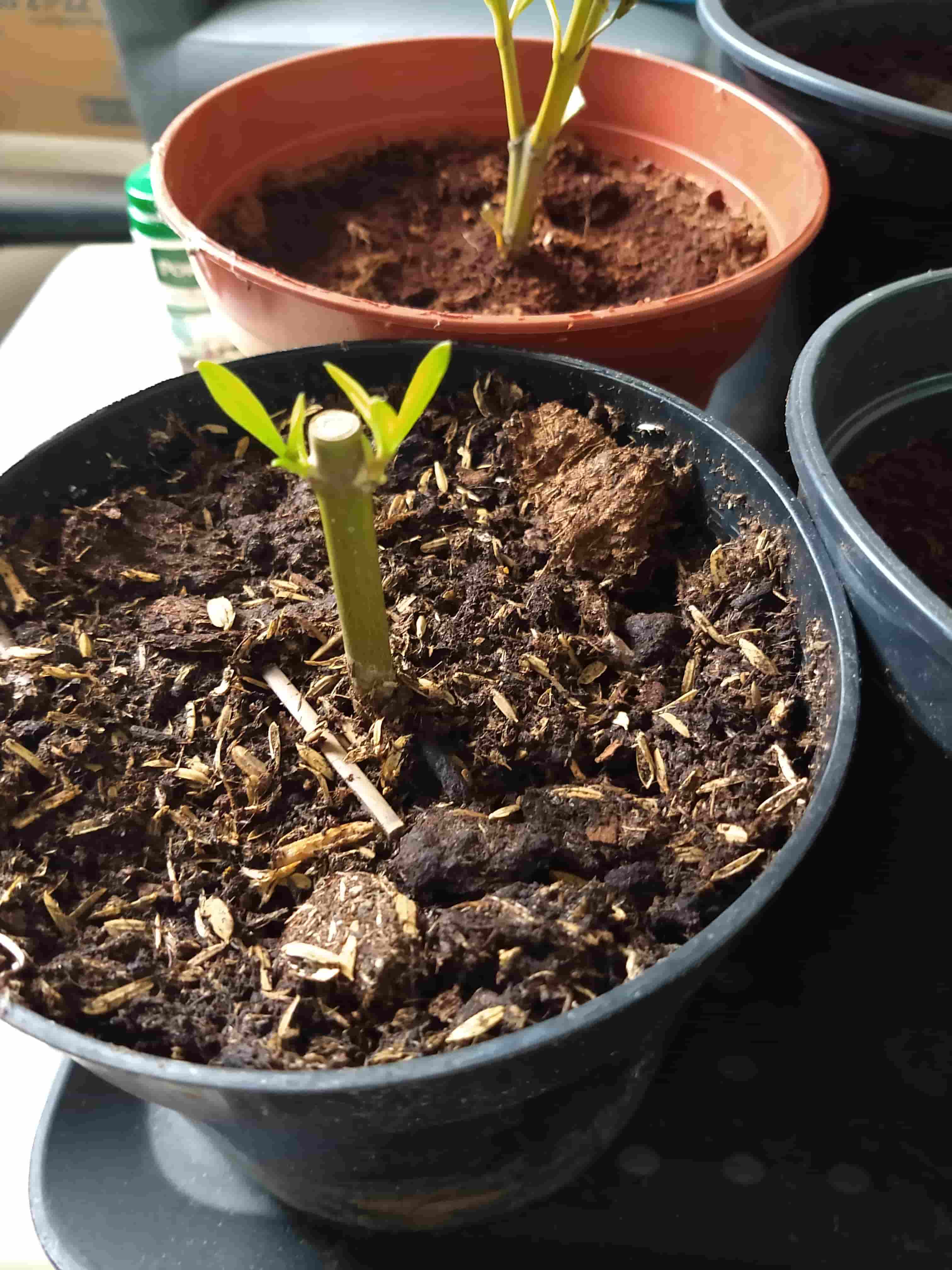 Voorzichtig heb ik hier en daar wat van de buitenkant geschraapt met een mesje en de wonden in stekpoeder gedoopt om de stekken vervolgens in kokosgrond te zetten. (Had ook zaai en stekgrond kunnen gebruiken maar die droogt naar mijn idee sneller uit als je niet afdekt).