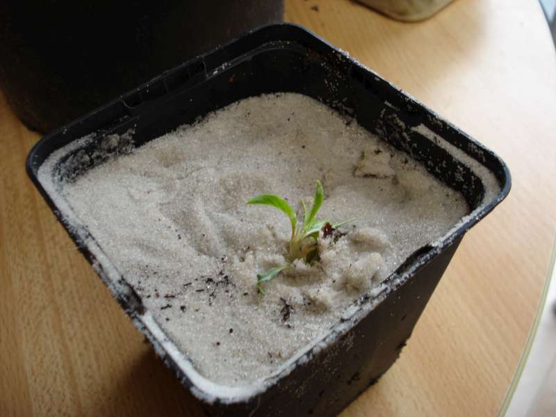 P9-potje, onderste helft met potgrond, bovenste helft met zuiver zand. De amandels steek je in het zand op 1cm diepte (tegen rotting), ook op 24°C in de kweekkas en de eerste is boven!!! Jippieee!!! :lol: