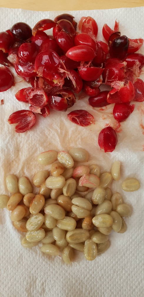 Na de eerste bessen van hun jasje te hebben verwijderd kwamen er mooie glibberige koffiebonen tevoorschijn welke ik alvorens te planten eerst 2 dagen heb laten drogen, opgepot ruim 6 weken geleden maar totaal nog niets waarneembaar, conditie 15-20 graden in een neutraal zaai medium.