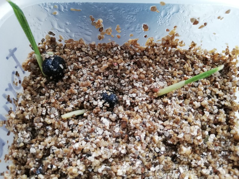 Omdat ik ontzettend veel zaden heb gekregen ben ik dingen gaan uitproberen. Zo heb ik ongeweekte zaden in een plastic Bossche bollen doosje met vermiculiet gedaan, samen met wat andere zaden, bamboe en Pilea peperomiodes (pannenkoekplantje). Dit doosje heb ik bij een raam gezet waar in de ochtend de zon op staat. Al snel zag ik groen tevoorschijn komen bij wat een pannenkoekplantje zou moeten zijn. Spannend! Binnen enkele dagen bleek het geen pannenkoekplantje te zijn maar klaver... Hmmm. Verder gebeurde er niets in mijn prachtige Bossche bollen kasje. Gevolg: deze werd verwaarloosd. Tot ik toch maar eens een kijkje ging nemen of er onder de vermiculiet toch iets was gebeurd. Verrassing! De Trachycarpus zaden waren gekiemd en hoe! Geweldig dat er toch beweging in zat. Inmiddels staan deze zaden in een hoge pot zodat ze mooi kunnen opgroeien. Hier is na enkele dagen op het vb oog niet veel gebeurd.