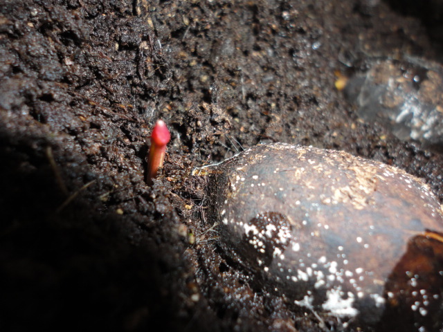 zoals Dimi het beschrijft is de goeie methode : het zaad half in de pot drukken ( een lange 2 liter pot) en wegzetten bij 28°- 32° (afdekken met plastic huishoudfolie, die je een paar keer perforeert) . Je ziet eerst (na een 4 à 6 weken) een witte kiem aan één van de uiteinden van het zaad. Dat is de wortel, die nu naar beneden groeit en pas vééél later ( kan nog eens 2 maand duren) zie je het blad verschijnen, zoals op de foto van Dimi.