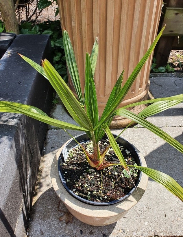 Trachycarpus tesan groeit flink. Nieuw blad en vette speer. Drukt nu onderste bladeren weg lijkt wel, is dit de vorming van een dikkere stam? Ik zie hetzelfde bij een T princeps van ongeveer even oud