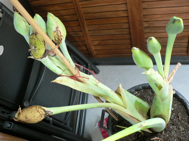 Ik heb de laatste grote hier zolang op zolder neergezet bij 19 graden omdat het in de kas maar 12 is en ik bang was dat hij het loodje zou leggen . heb dit ook gedaan omdat ik er vanuit ging dat de zaadbollen sneller af zouden rijpen .Verder heb ik nog 3 planten ( kleinere ) bij 12 graden in de winterstalling staan ,helaas word daar niet warmer gestookt deze winter dus ik weet niet of deze het gaan redden .Tot nu toe zijn ze wel stabiel.