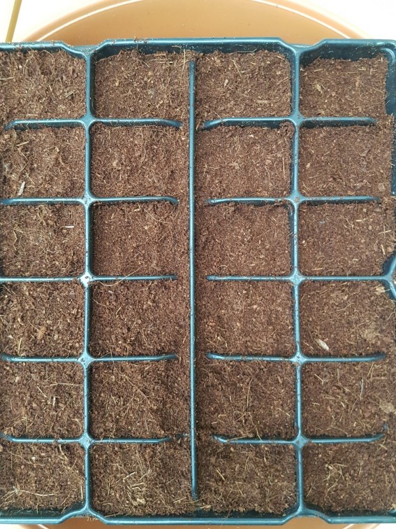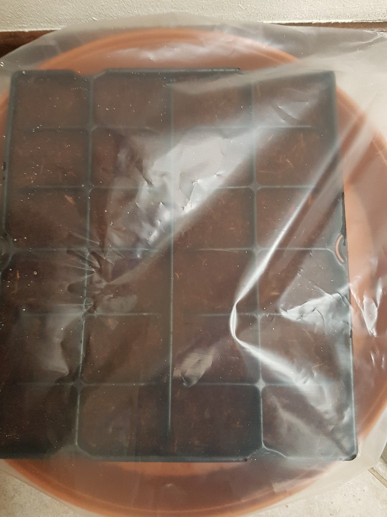 Deze 1e serie zaden wederom niet behandeld en ga ik in serre boven de 15 graden kiemen. Deze serie van 24 zaden, zo groot is mijn tray in reeds voorgekookt water 20C gegooid en op de radiator in een glas laten weken. Deze gaan (over) morgen in de los geweekte cocoblokken aarde van de palmshop . Nu 1 zaadje per blakje in tray. Dan plaats ik een transparante zak erover, mini kas creëren en 1 maand niet naar kijken.