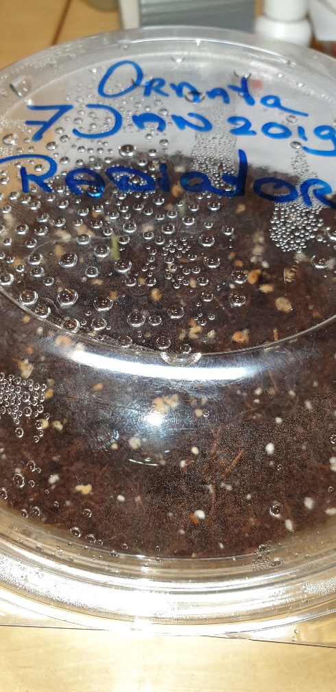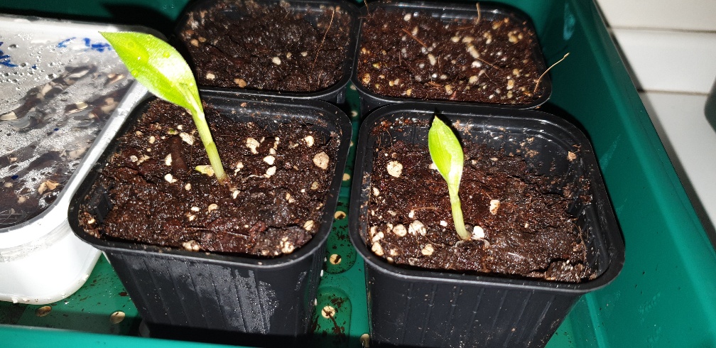 Fruitsalade bakje nu in afgelopen 3 dagen 3 kiemers, op radiator, ervanaf en dagje in de zon elke dag kijken/luchten ;)