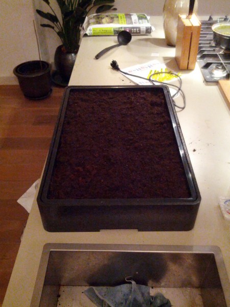 daarna volledig opvullen met zaai en stek grond, goed bevochtigen en een nacht op temperatuur laten komen.