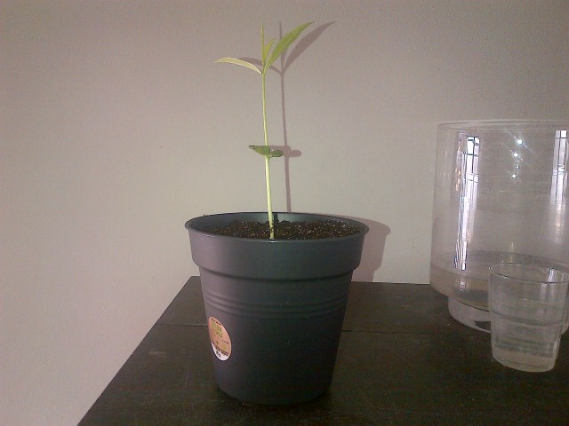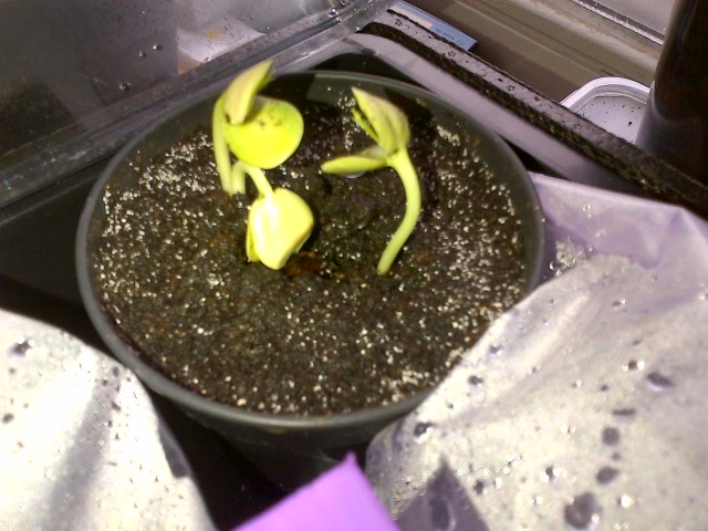 Ik heb de plantjes ondertussen apart staan, de twee die je links op de foto ziet (vlak tegen elkaar) heb ik gesplitst door ze met de stekgrond in een grote pot met water te plaatsen zodat de grond 'oplost' en je ze makkelijk van elkaar kan scheiden, zonder de wortels te beschadigen, wist niet hoe ik anders moest doen...de pit is al verwijderd, aangezien de laatste zaailing deze mee naar boven duwde....sterke jongen :lol: