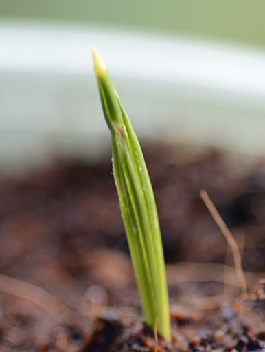 Zo te zien heeft de zaailing al licht gekregen in je propagator. Anders blijft de spriet wit. Je kan haar er nu wel uithalen. Het is buiten de propagator ook lekker palmenweer.