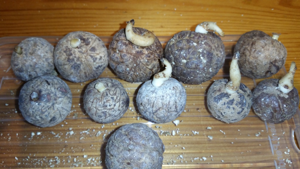 Op de foto hieronder twee zaden zoals ze hier zijn binnen gekomen, wel andere soort maar de meest rechtse ziet er veel belabberder uit dan op de foto hierboven en toch na een week of 6 al zijn speer aan het vormen ondergronds.