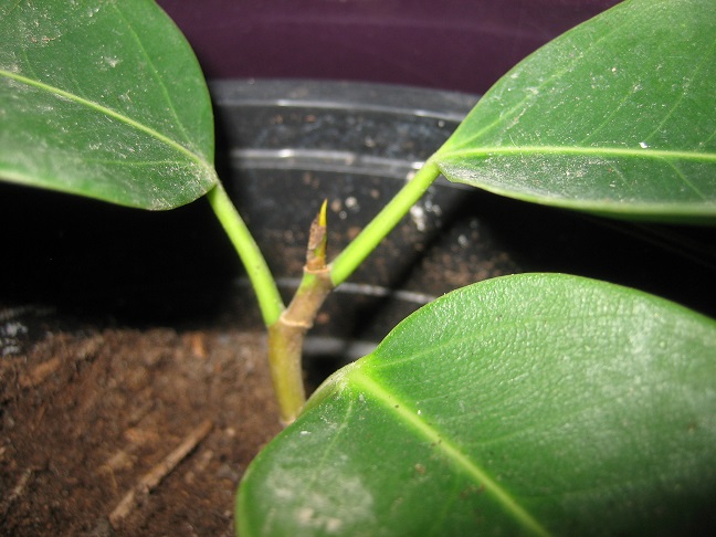 Ik denk allereerst aan Ficus ? Als je in het blad prikt komt er dan wel/niet een wit 'melksap' vrij (Ficus - rubberboom - latex) ? De bladknop is door een vlies (schutblad) omhuld, dat afvalt wanneer het nieuwe blad zich ontrolt.