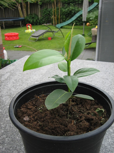 Daar in Rhodos stonden ze overal als kleine geknipte boompjes en mij viel op dat het nieuwe blad als een opgerold blaadje uit de kroon van de blaadjes komt zoals te zien op de foto.