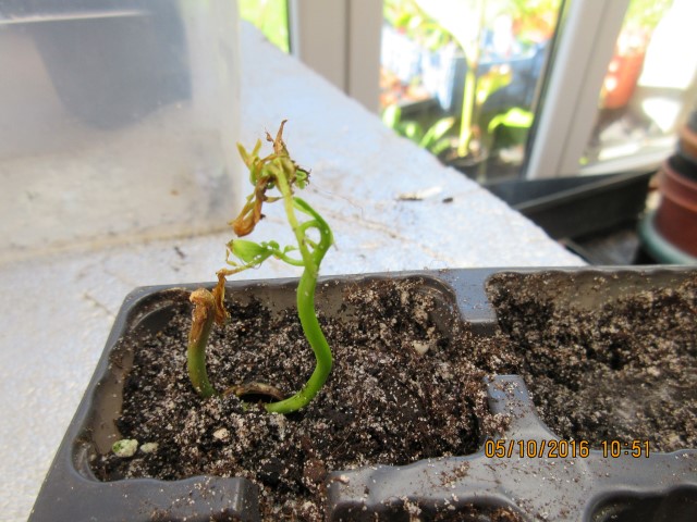 Had 3 zaden en heb gedaan wat Paulien zei, aangevijld in vochtige grond gezaaid en warm gehouden, zie hier het resultaat na +/- 14 dagen 1 is er gekiemd maar ik denk dat de kiemling niet goed weet waarheen, er kwam eerst tamelijk vlug deze groene stengel naar boven, daarna een halve cirkel en nu komen er blaadjes op, heb geprobeerd dit wat los te maken maar het zaad kom mee naar boven.