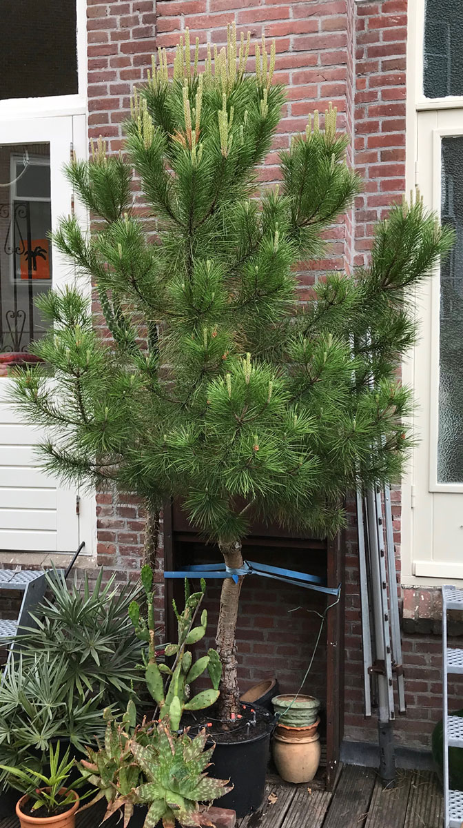 Ik vermoed ook dat de P. pinea op de foto groter zou zijn als die in de volle grond zou staan, hoewel hij nu toch ook al ruim 2 - 2,5m hoog is.