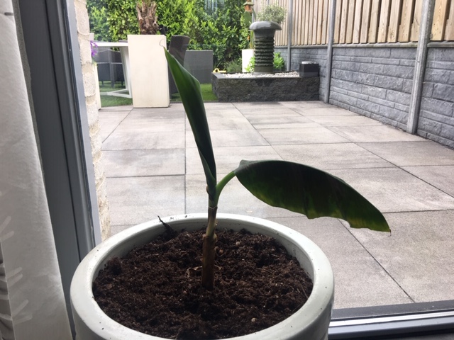 Ik heb een mooie stek van mijn bananenplant afgehaald en deze direkt in de potgrond gezet.
