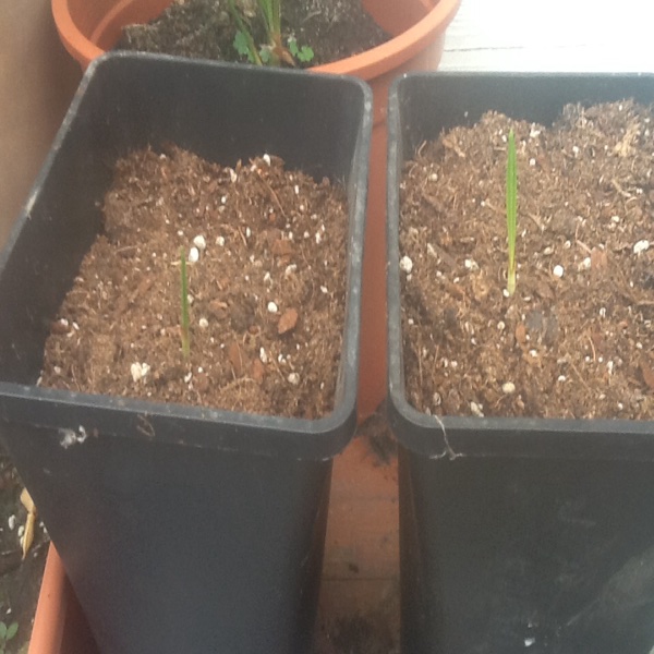 Afgelopen weekend zag ik hiervan de eerste resultaten. Het duurt dus wel even alvorens deze opkomen. Ik heb ze al die tijd buiten in een bak laten staan, dus geen propagator gebruikt. Vanwege de flinke penwortel heb ik ze in diepere potten gezet.