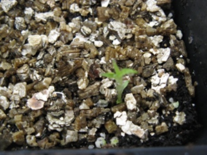 Een hele tijd geleden ontdekte ik dat er vlak onder de schil van een rijpe ananas, hier en daar zaden zaten ( in de putjes die je er anders nog moet uitpeuteren ) Ik had er geen idee van hoe groot ananaszaden eigenlijk moeten zijn ( lijken wat op lijnzaad maar iets kleiner) Nieuwsgierig als ik ben , heb ik deze zaden gereinigd en vrij oppervlakkig gezaaid in een bloempot met zaai en stekgrond en afgedekt met folie.Warme voetjes gegeven ( onderwarmte) en tot mijn grote verbazing heb ik pas gemerkt dat er eentje gekiemd is