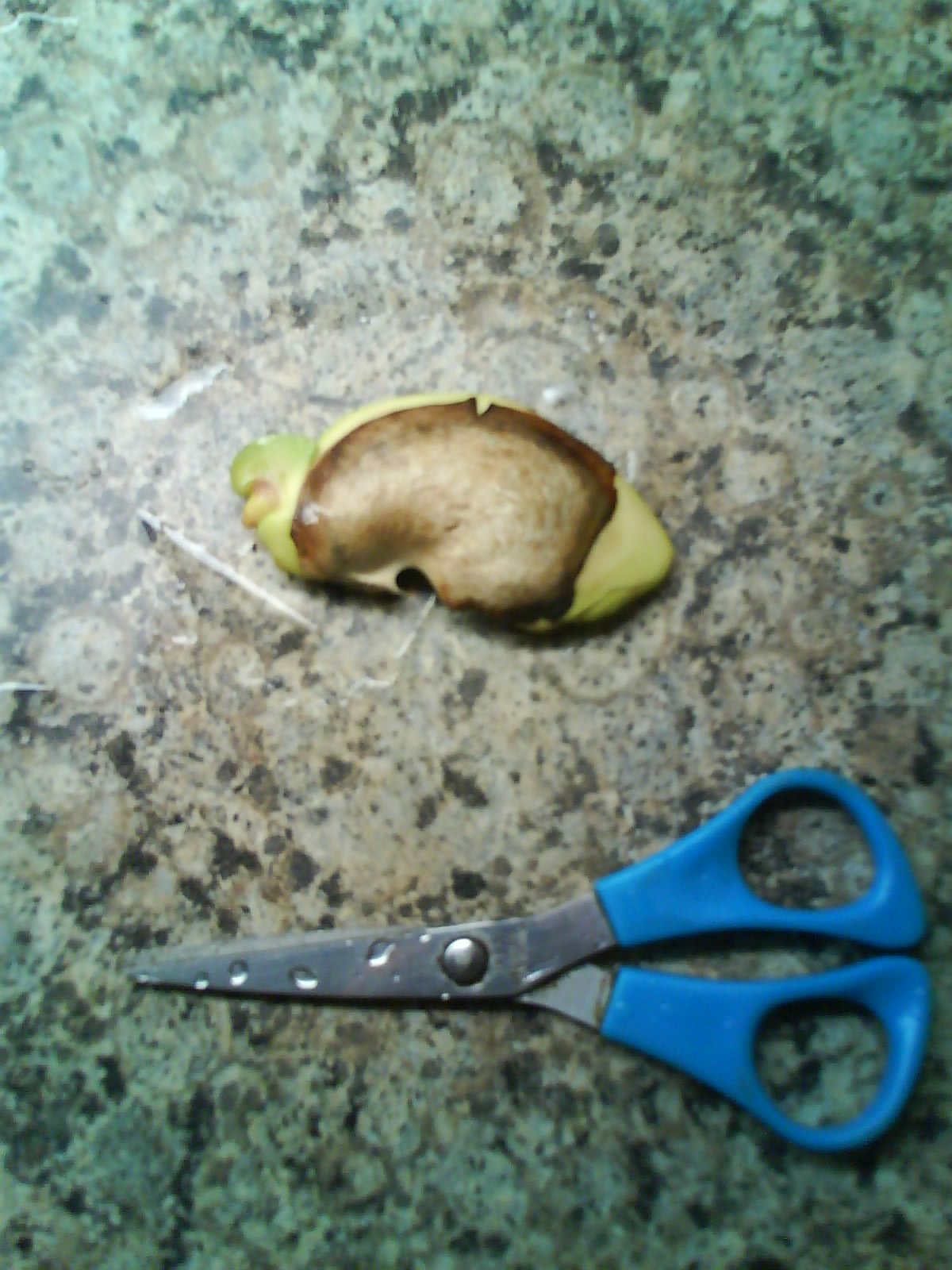 Hij was al aan het uitlopen. De schil was trouwens ook al opengescheurd op de plek van de eerste blaadjes en wortel (aan de linkerzijde van de pit).