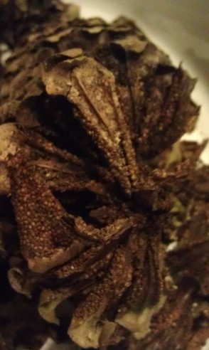Ik heb vandaag een kegel van de Mexicaanse palmvaren (Dioon edule) gekregen. De vele zaadjes zijn niet allemaal vers meer, er zitten nogal wat gaten in. Het zijn er 1000'den