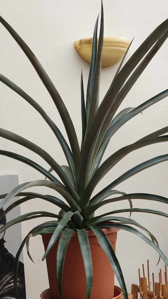 de kruin/moederplant heeft inmiddels ook al weer 4 nieuwe stekken gegeven maar zoals reeds een paar vrienden hier al aangaven, een bromelia soort is een plant waar je van moet houden . Lange bladeren met een eind stekel waar je U tegen zegt. Prachtig solitaire plant met toefje op de taart waar je ruim 2 jaar op moet wachten. Zoals reeds vele experimenten uitproberen en na suc6 stokje overdragen ivm te weinig ruimte, ;)