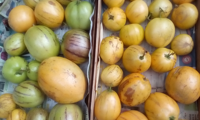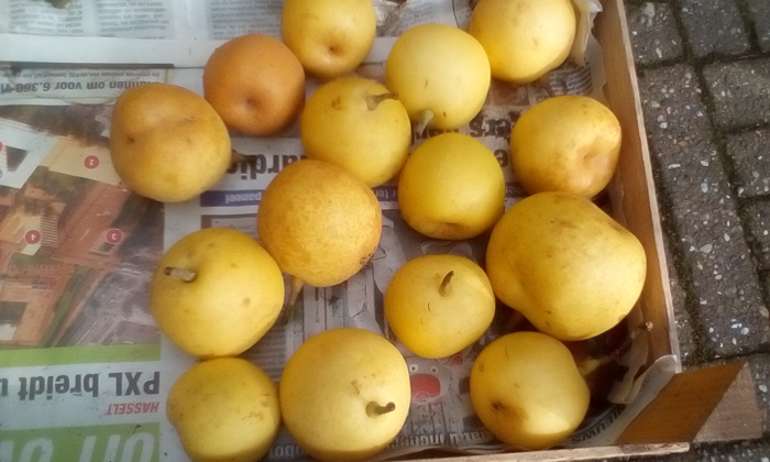 Afgelopen week wat geoogst in verband met nakende nachtvorst. Dit jaar zijn de opbrengsten heel wat minder allicht door het koudere voorjaar maar vooral door de overstromingen in juni. De appels daarentegen zijn er overvloedig. De droge zomer heeft dan weer tot gevolg dat de vruchten ook minder sappig zijn.