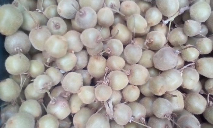 Mini kiwi 'Jenny', de echte kiwi hangt nog te rijpen