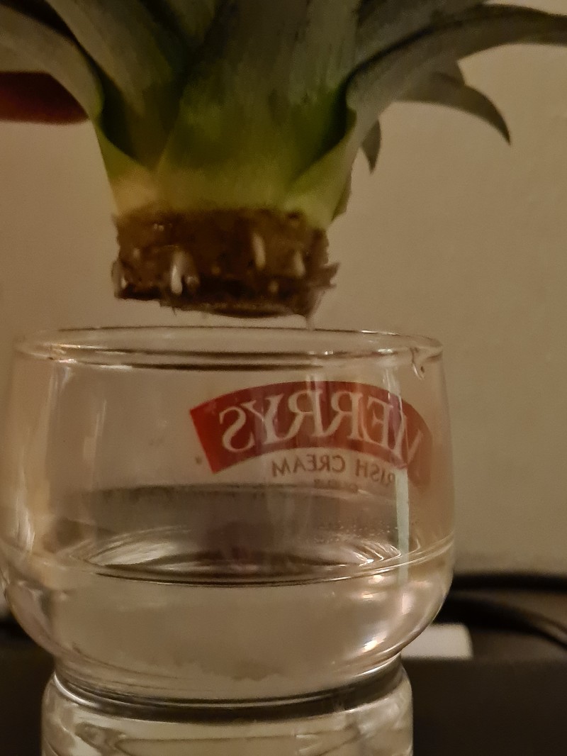 De Stekken na het eten van de ananas gelijk in mijn favoriete palmaarde gestoken en de kroon op water gezet. Maw op 2 Maart dus ook maar weer opgepot.
