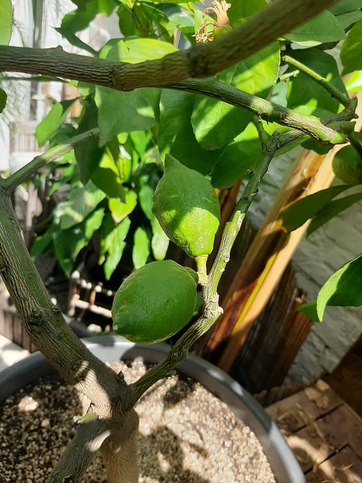 Momenteel heb ik een zelf gezaaide citroen van 5 jaar, een geënte met afrijpende vruchten eraan en een calamondino.