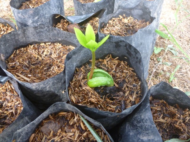 Bij ons in de tuin staat een Cashewnotenboom, Anacardium occidentale. Deze boom hebben wij uit een noot op gekweekt en is nu 6 jaar oud. Hij begint nu vruchten te geven. Ik heb daar enkel van gepland in aarde en nu na ongeveer 14 dagen komen ze al boven de grond. Het is hier dagelijks rond de 30 á 34 graden en snacht rond de 26 graden. Zo te zien een goede temperatuur voor het laten kiemen van de Cashewnoten.