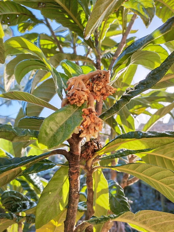 Een nagekomen bloemtros. Er zijn al wat bloemen bevrucht. In de tropen waar de Mango thuishoor worden er heel veel bloemen bevrucht en hangen de vruchten als druiventrossen aan de bomen. Als ze rijp worden laten ze los en als je onder wat mangobomen loopt dan hoor je plof ... plof ... plof. Het regent mango's.