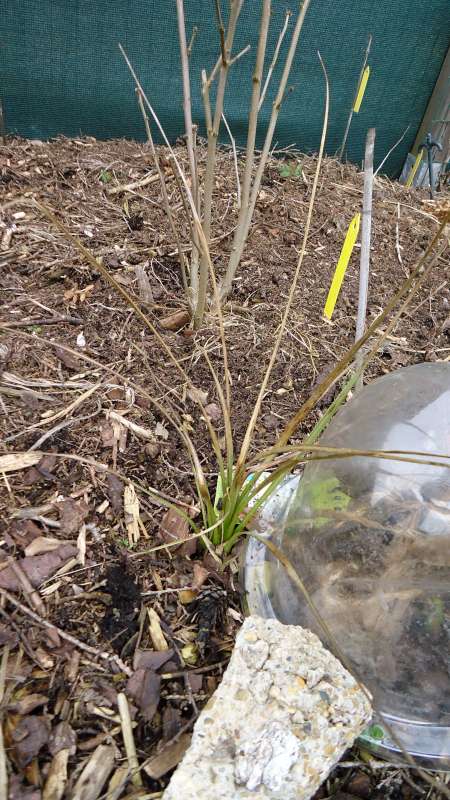 Bemerkte in de tuin deze plant die als verstekeling moet zijn meegekomen met de plant die onder het kuipje staat. Ik had hem in het late najaar wel opgemerkt maar dacht toen eerder dat het gras of zo was dat ik in het voorjaar wel zou verwijderen. Heb er verder geen aandacht meer aan geschonken. Nu ondertussen lijkt het mij eerder een Cordyline australis te zijn en deze is buiten wat verbrande bladuiteinden te hebben de winter goed doorgekomen zonder de minste vorm van bescherming.