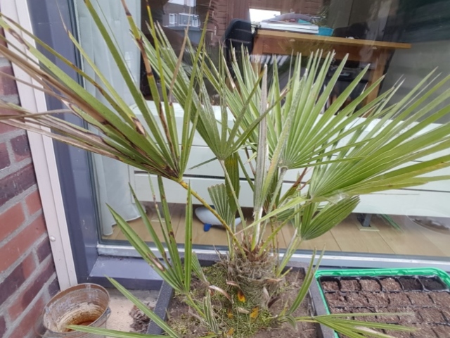 Chamaerops humilis. Kan prima buiten in een pot op het terras of een zonnige, beschutte plek in de tuin. Bij aanhoudende kou vanaf ongeveer -8/-9 beschermen met vliesdoek en boomsnippers rondom de wortels. Het groeipunt goed beschermen tijdens sneeuw, ijzel d.m.v. afdakje (paraplu o.i.d.).