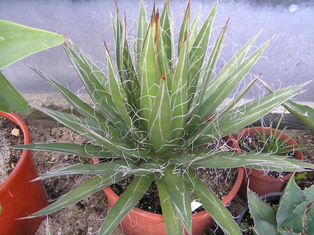 Deze recente aanwinst arriveerde naamloos. Ik heb deze Agave nog niet eerder gezien. Vermoedelijk is het Agave multifilifera en misschien kan iemand dat bevestigen?