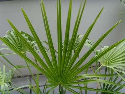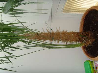 ). Maar ik klaag niet, het is meer duidelijk waarom hij in de huiskamer overleeft, en het is een schitterende boom, 3,5 tot 4 meter hoog in totaal(met pot). De stam is zo'n 1,20. De stelen van de bladeren zijn zo'n 2 tot 2,5 meter lang, hebben scherpe stekels, maar alleen op de eerste helft(vanuit de stam gezien). Mijn beperkte ervaring, en na wat onderzoek, lijkt het mij nog het meeste op een Livistonia Chinensis, maar 100% zeker ben ik niet. Het enige wat ik zeker weet is dat hij NIET uit een dadel pit gegroeid is...