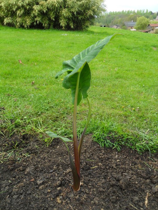 Ik had mijn dochter net voor Kerstmis naar Exotic World in Leuven gestuurd omdat ik een exotisch dinertje in mekaar wou boxen voor Kerstmis. Ik had ze terloops gevraagd wat Taro's mee te brengen om later mee te experimenteren. Nu blijken die knollen een zwarte variëteit te zijn en geen "gewone" groene. Hierbij enkele foto's, de 2de foto is van begin januari, toen stond die knol al een maand in de grond. De volgende 2 foto's zijn van vandaag. Ik heb ondertussen ook de andere 3 knollen opgepot.