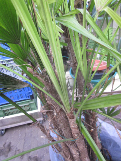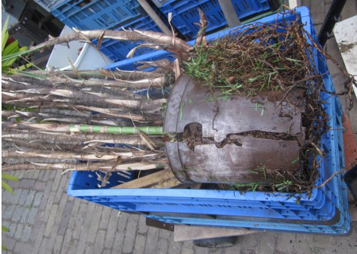 Toen ik vandaag voor de 2e keer op die dag op de groenstort kwam dacht ik hey daar ligt nu een palm. Even beter kijken en het was inderdaad een palm. Hij had op hydrocultuur gestaan en er lag een berg gras op. Even de palm eronder weggehaald en even bekeken. Het viel me op dat bijna elke afzonderlijke stengel een nieuwe of groene speer had. De een iets groter dan de andere. Ik heb die dus maar meegenomen naar huis. Wil hem nog een nieuwe kans geven.