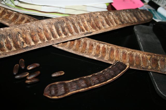 het zijn grote zaden (ong. 1 cm), in grote lange houtachtige peulen,