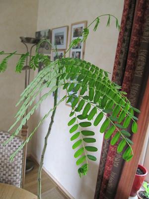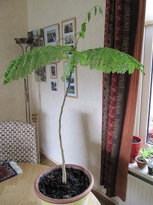 De bovenste zijn Delonix maar het onderste niet: zie maar naar de vorm van de blaadjes, die eindigen licht puntig en bij de Delonix zijn ze afgerond. Mij doet het denken aan een Albizia, vouwt het plantje ook zijn blaadjes dicht iedere avond? Een Albizia doet dit veel duidelijker nog dan de Delonix. De versie die ik heb heeft roze bloemen, misschien zijn er ook wel soorten met gele bloemen.