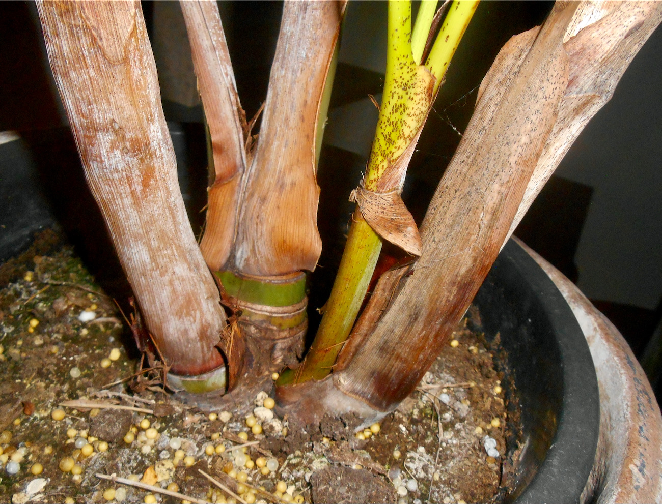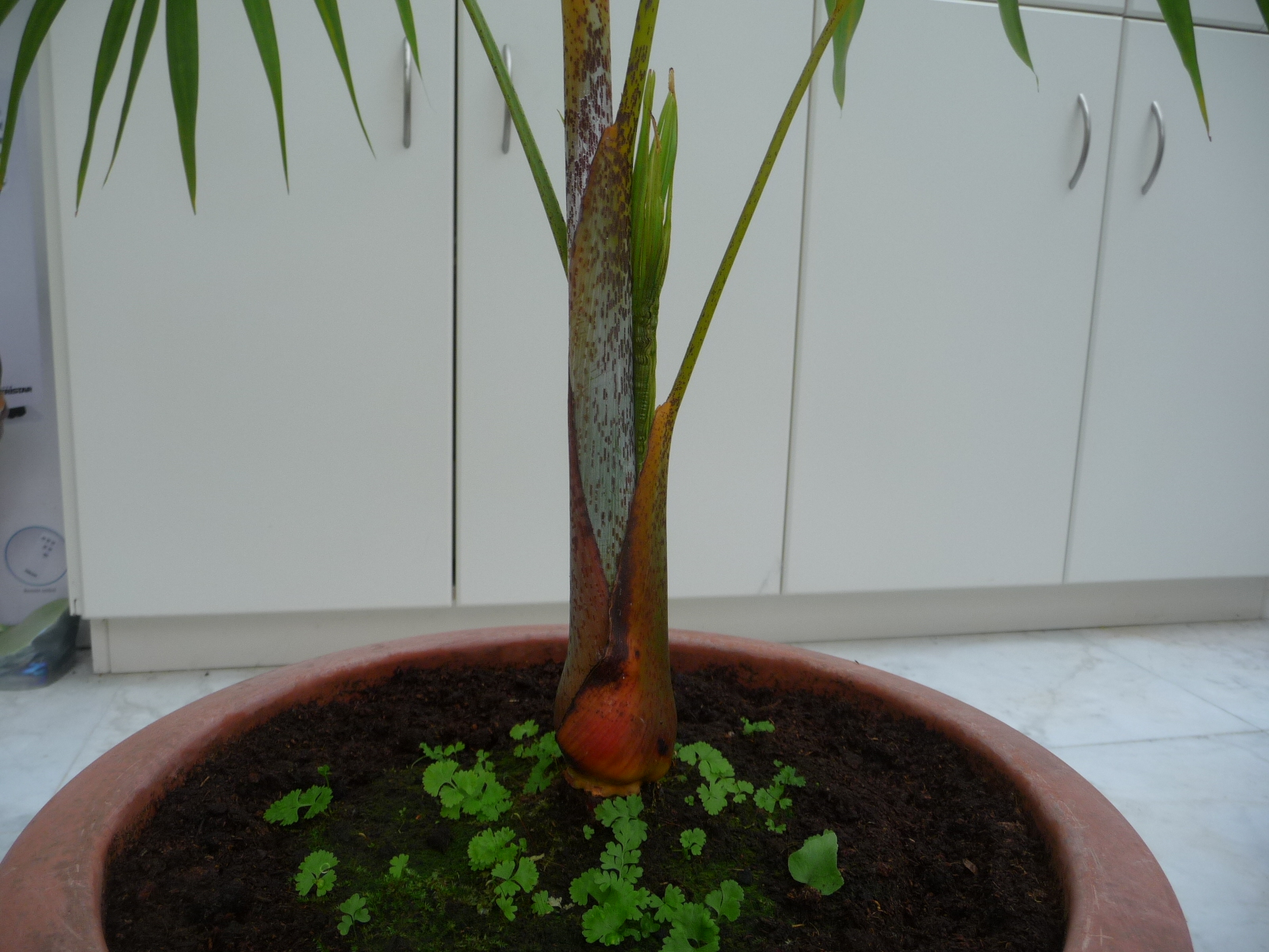 Dypsis lutescens komt hiermee weer in beeld Eduard. Die vormt clusters en niet alleen onderaan de stambasis maar ook hogerop duit een bladschacht. Ik heb hier zo'n goudpalm staan met een splitsing.
