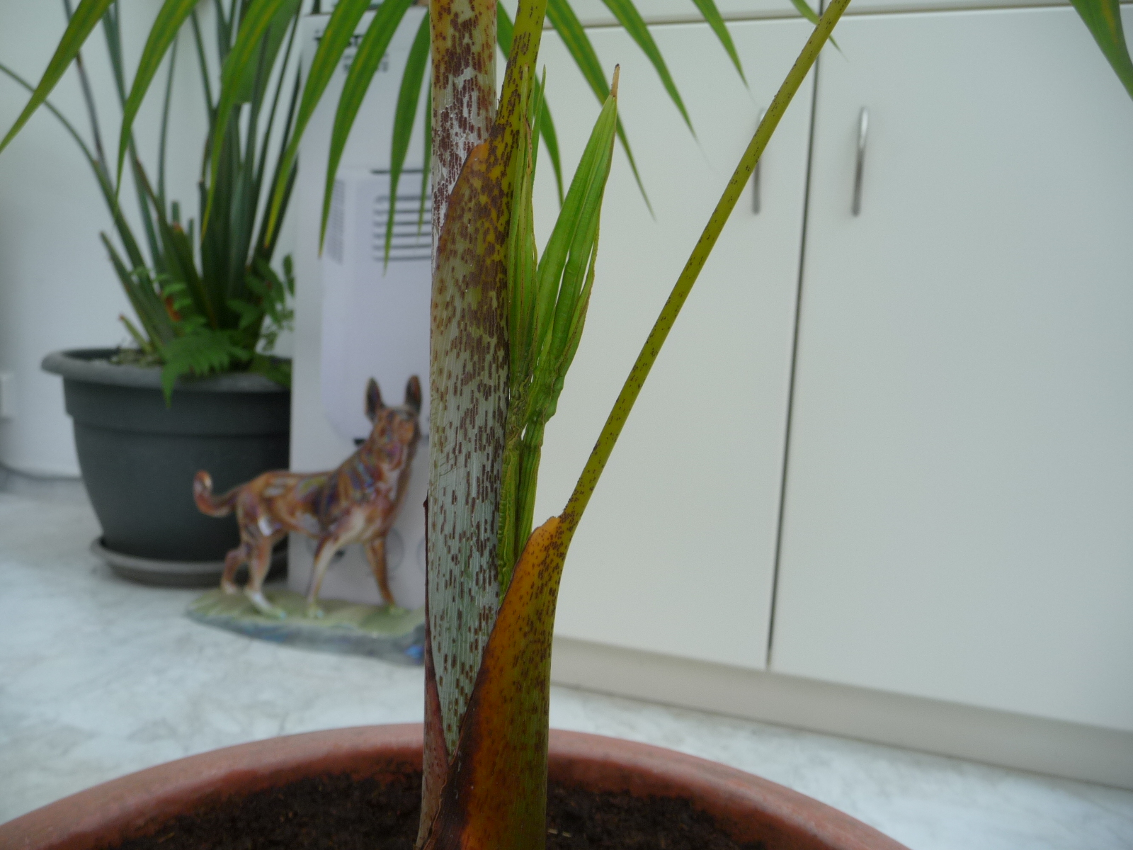 Ik zi tegen die rode rachis aan te hikken - nog nooit waargenomen bij de gangbare Intratuin Dypsis lutescens - dan moet het op zijn minst een meer afwijkende Dypsis zijn...er zijn er idd zat die dewrgelijk rood uitlopen...