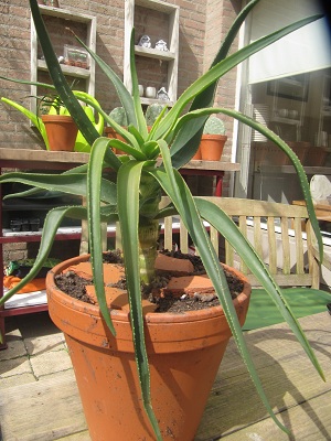 Ik heb enkele pieken afgesneden van een flinke bos aloe, heb de wond de tijd gegeven om zichzelf dicht te hechten (dit ging razend snel/ amper 2 dagen) en ze in de potgrond gestoken. Iemand vertelde mij, "dit spul slaat altijd aan". Deze volwassen moederplant heeft in de afgelopen winter enkele malen flink onder de sneeuw gelegen maar is niet bloot gesteld aan langdurige of diepe vorst periode.