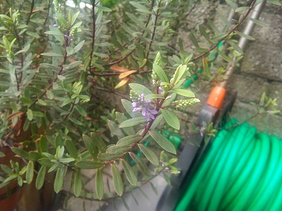 Ik heb een plant of struikje in een pot. Kleine blaadjes rondom aan iedere tak. Een nu komen er paarse bloemetjes in. Ik heb alleen geeeeeen idee wat het is.