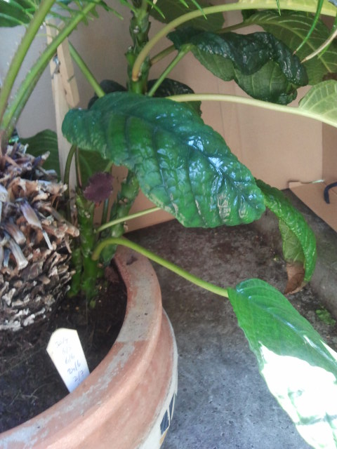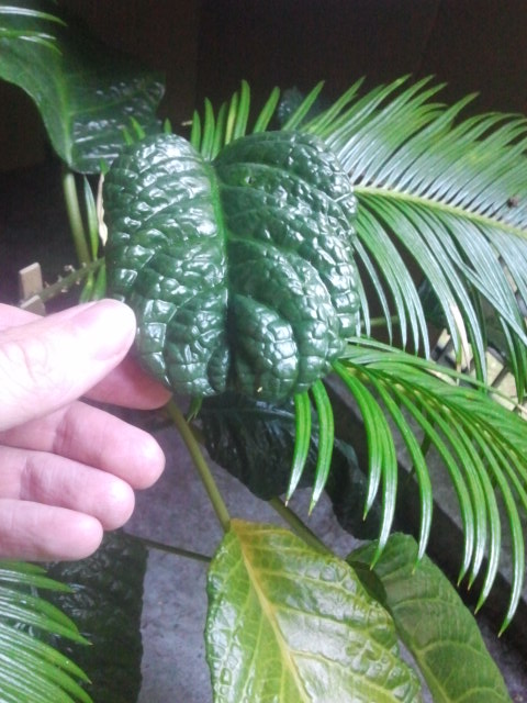 Zoals je kan zien bestaat de plant uit een dikke vlezige hoofdstengel. De bloemetjes zijn donkerpaars en de grote bladeren voelen "kunstmatig" aan.