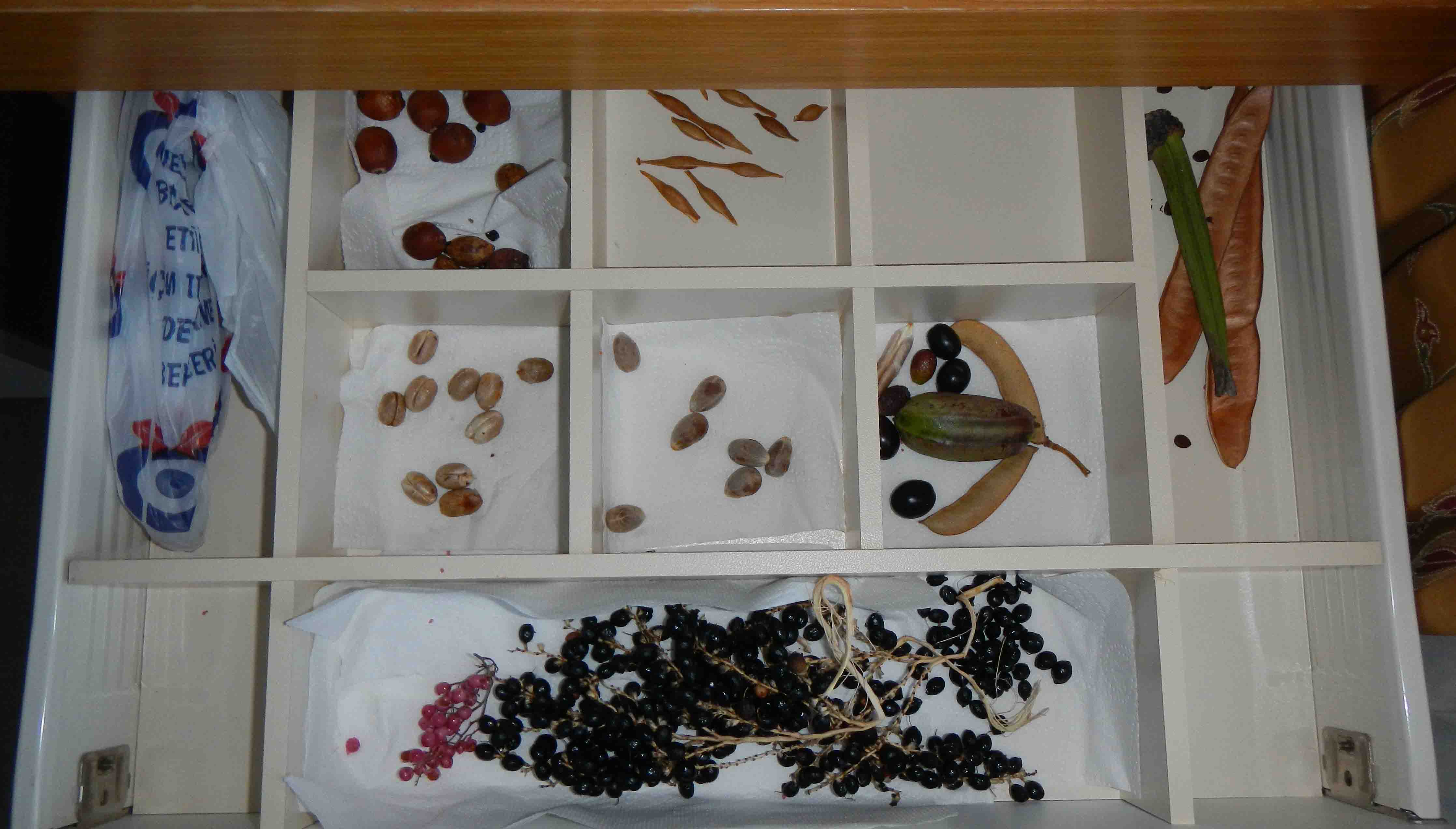 Ik heb er inderdaad een zaadbol vanaf gehaald. Hij was nog wel niet helemaal rijp. Zie lade kleine vak midden rechts, die grote langwerpige bol. Thuis heb ik de zaden er uit gehaald en ze waren bijna allemaal hard en zwart. Trouwens bedankt voor de identificatie.