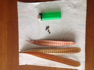 Zaadpeul met zaadjes en aansteker voor formaat.