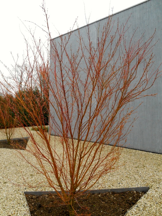 Daar heb ik ook aan gedacht, maar in mijn belevenis is de kleur van de twijgen bij "Sangu Kaku' dieprood in plaats van dit warme oranje. De opgaande groeiwijze bij deze Acer toont wel overeenkomst met die van de Sangu Kaku. Anders moet ik het maar eens aan de eigenaar van deze villabunker vragen. Misschien heeft hij het naamlabel bewaard.