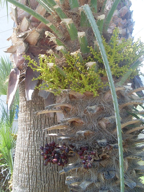 Phoenix canariensis en Chamaerops humilis met (vrouwelijke) bloeiwijze en zaad. De zware stam is kenmerkend voor de canariensis. Phoenix theophrastii vormt net als de Chamaerops clusters.