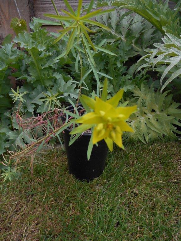 Waarschijnlijk hangplantje. Geeft momenteel hel gele bloempjes van 2 à 3 cm doorsnede.