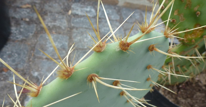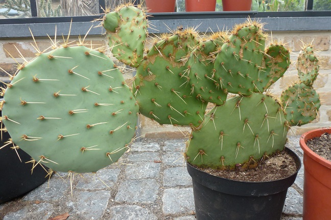 Ik heb al enkele jaren een mooie Opuntia staan waar erg grote schijven op komen. De plant heeft al diverse winters buiten overleefd maar heeft nog niet gebloeid. Ik zou graag weten welke soort het nu juist is maar Opuntia's identificeren is blijkbaar niet echt gemakkelijk. Als ik vergelijk met foto's op het net denk ik zelf aan O. engelmannii var. Lindheimeri of O. phaecantha. Of is het nog wat anders?